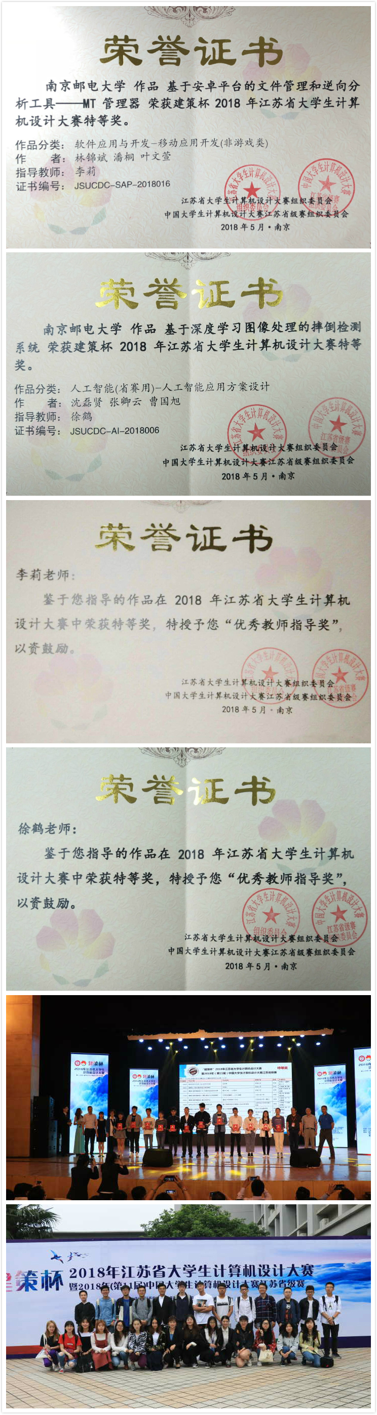 2018年江苏省大学生计算机设计竞赛(简称竞赛)落下帷幕,我院学子有两组选手荣获特等奖,两个一等奖与一个二等奖。其中来自我院的李莉与徐鹤老师荣获竞赛优秀老师指导奖。