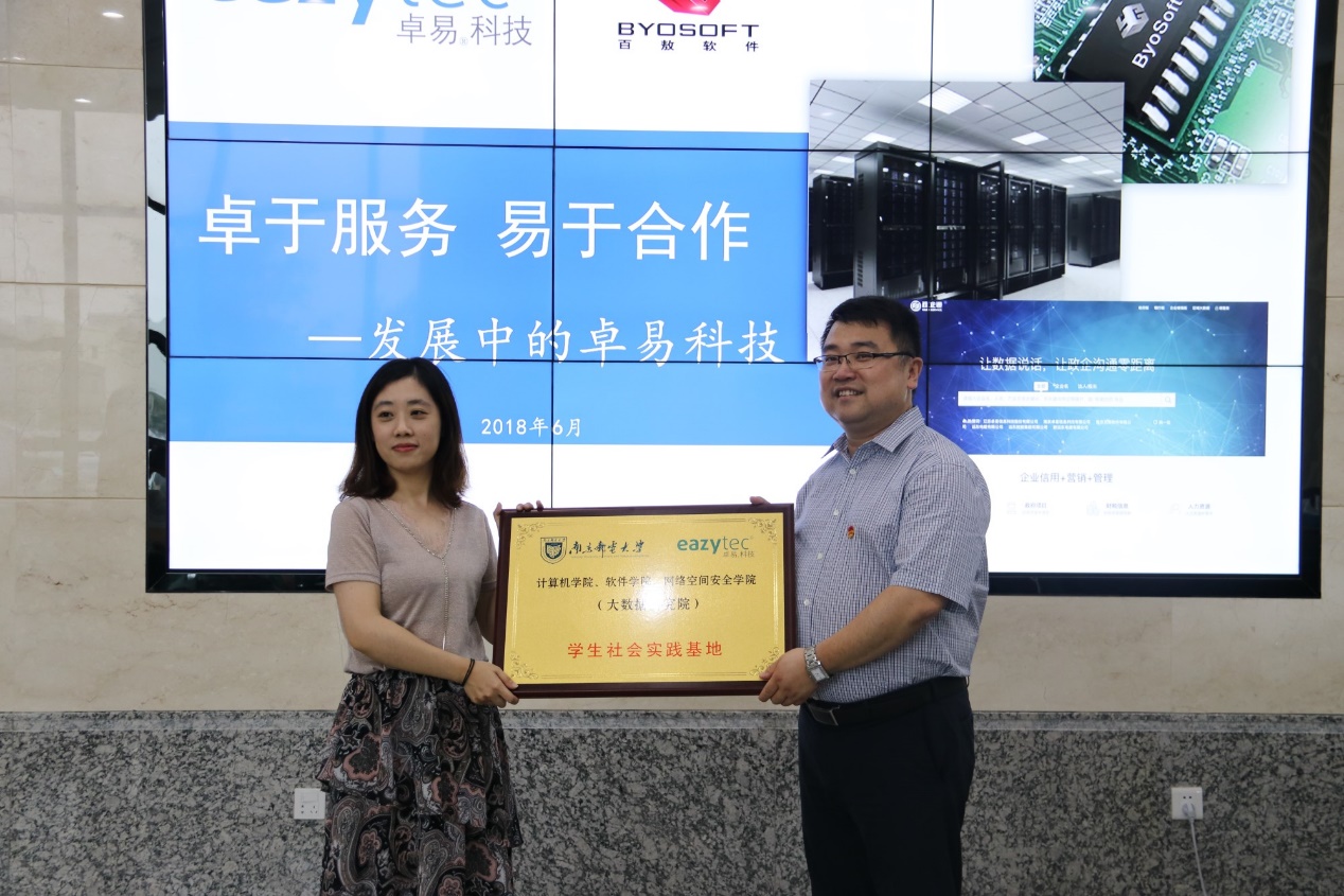 仪式伊始,卓易科技人事首先对我院师生代表的到来表示热烈欢迎,紧接着,她将卓易科技的发展及产品等进行了详尽介绍,使大家对卓易有了一定的了解,同时,她也欢迎我院学子前来卓易软件园学习、实践、工作,希望卓易与我院的合作能够顺利开展,让双方都得益。而后,同学们针对卓易科技提出了一些自己的问题,卓易科技人事对此一一详细解答,仪式最后,我院党委副书记、副院长何海洋与卓易科技相关负责人共同为bdapp体育 、半岛app应用 、半岛电子官网 (大数据研究院)学生社会实践基地揭牌。