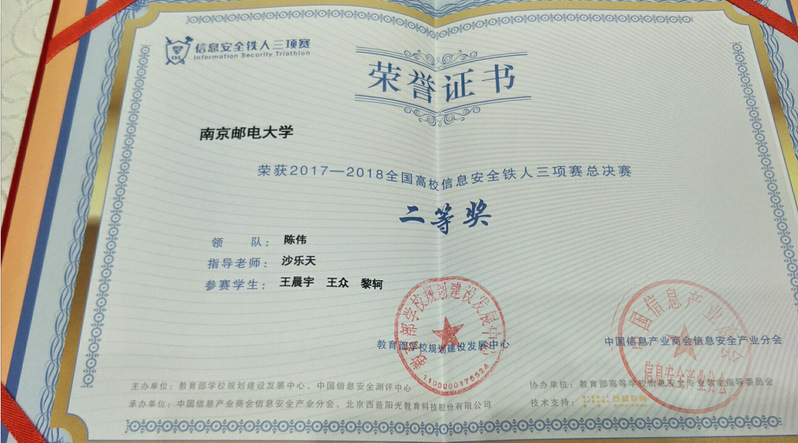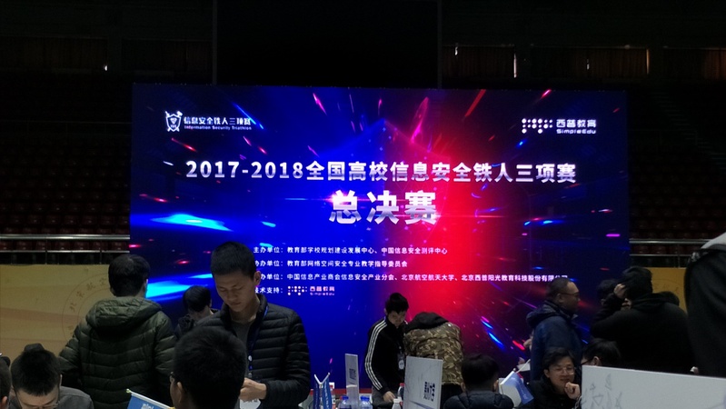 2018年12月7日,2017-2018全国高校信息安全铁人三项总决赛在北京航空航天大学盛大开幕,来自全国57所高校的网络安全实战赛队在“数据赛、企业赛、个人赛“三个方向比赛中一决高下,为全国网络安全市场提供了新一批高端人才。由沙乐天老师指导的我校bd手机版官网登录ios 、半岛app应用 、半岛电子官网 黎轲、王晨宇、王众同学(X1CT34m战队)荣获总成绩二等奖,奖金10000元。该项成绩充分体现了我校信息安全学子在国际级CTF赛场上实战领域的动手能力及创新水平!