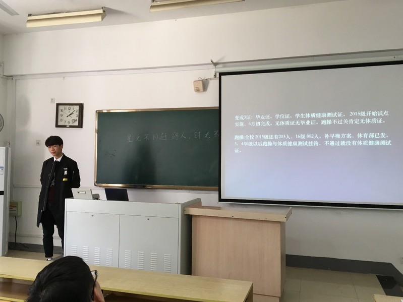 接着,辅导员陈龙老师为同学们分析毕业目标,给大家相应的指导,主要分为考研和就业两块内容,用数据和事例来让同学们了解考研和就业的挑战以及各位同学所要努力的方向。在班会进行的过程中,每位同学都认真聆听,有些同学还时不时点头并且记录内容,陈龙老师还为大家带来了许多就业指导的干货,分享了学校就业实习招聘的信息网站等。另外,陈龙老师在提问环节积极为同学们解答疑惑并且单独给就业和考研有困难的同学以分析和辅导,给予全体同学全方位的支持和心理帮助。