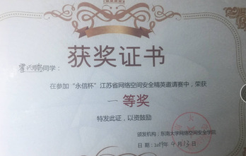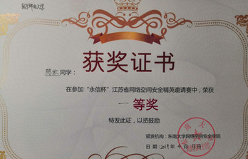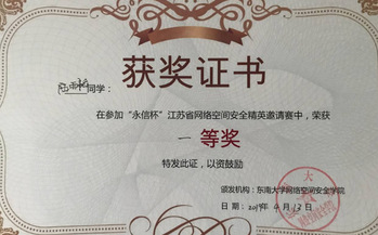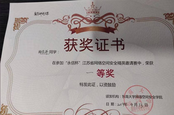 4月13日,2019年“永信杯”江苏省网络空间安全精英邀请赛总决赛在东南大学盛大开幕,来自江苏省30多所高校的网络安全实战赛队参赛,最终,由我院沙乐天博士指导的小绿草信息安全实验室成员安邹翔(计科大一)、霍兴鹏(信安大一)、陆雨韬(信安大二)组成的ORZORZORZ战队和陈欣(信安大一)、周佳洋(信安大一)、周峻全(信安大二)组成的m3etc1x战队分别获得第一名和第二名,该项成绩充分体现了我院新生学子在CTF赛场的实战能力和水平。