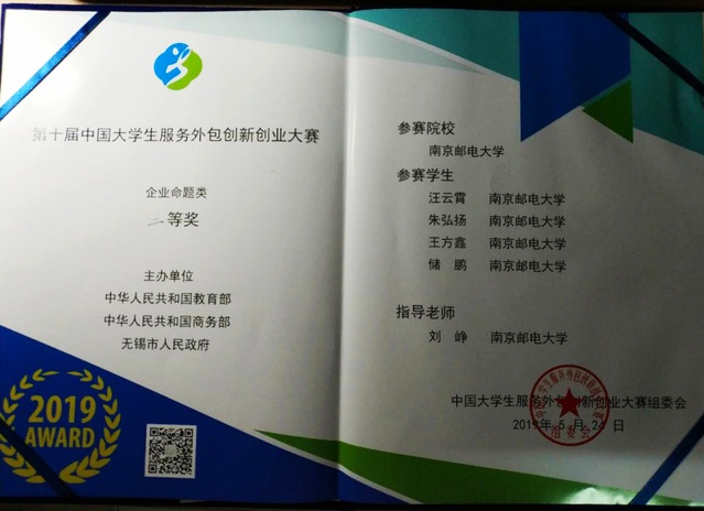 2019年5月22日至5月24日,第十届中国大学生服务外包创新创业大赛在无锡江南大学举行。我院刘峥老师指导的,由我院汪云霄、王方鑫、储鹏和电子与光学工程学院、微电子学院的朱弘扬同学组成的代表队荣获企业命题组团体二等奖。