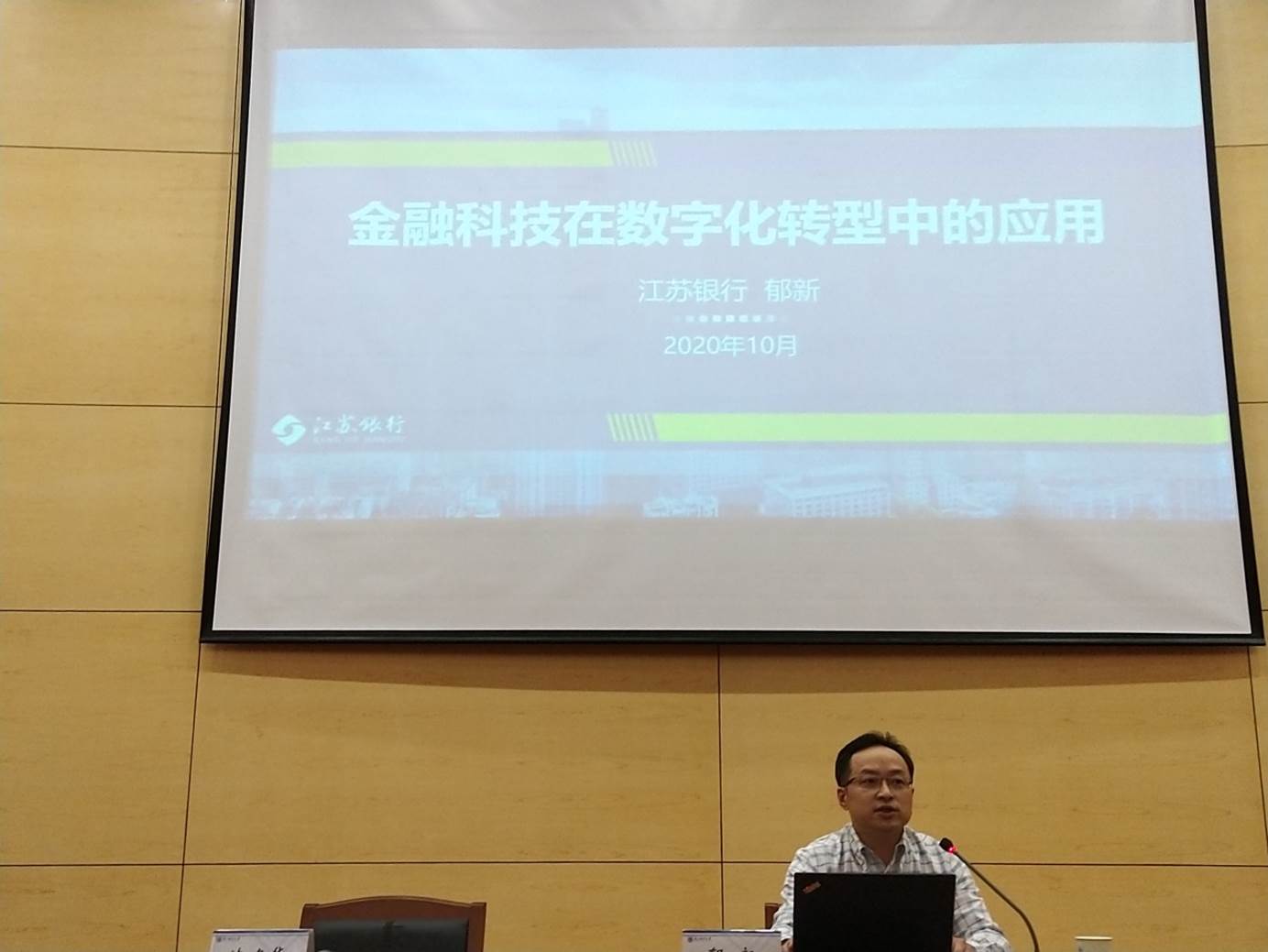 郁新总经理介绍了新一轮信息技术革命对社会和经济的深刻影响,给我们理顺了金融、银行、数字化之间的关系。他从银行IT的发展、银行IT部门的变迁、银行新技术基础平台、银行新技术研究、智慧银行建设、金融科技风险、随e融等方面阐述了金融与技术融通的重要性,指出金融行业数字化转型需要金融科技创新与银行传统业务的深度融合,希望同学们在大数据时代下培养复合型能力、主动思考能力,要有开拓创新的勇气,具备风险防范的能力和意识,能为金融科技发展和数字社会建设做出积极贡献。