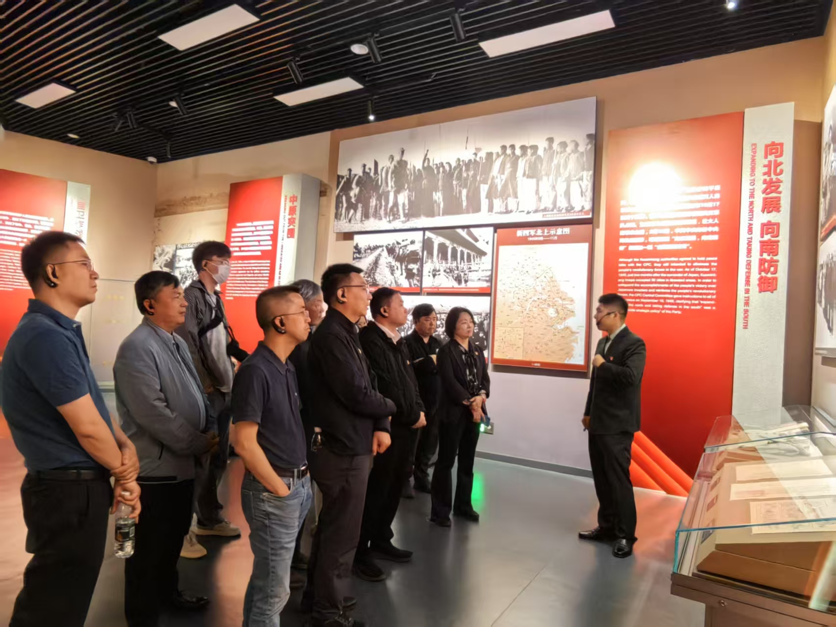 党课结束后,全体成员怀着崇敬的心情走进新四军纪念馆展厅。在讲解员的引导下,大家依次参观了“民族危急 铁军诞生”“抗日战旗 遍插华中”“重建军部 浴火重生”“兵民鏖战 坚持敌后”“战胜困难 建设根据地”“局部反攻 扩大解放区”及“走向胜利 铸造辉煌”等展区。全体成员不时驻足凝视展柜中锈迹斑斑的电报机、泛黄的密电码本等文物,聆听“17岁旗袍”“带弹孔的军装”等感人文物背后的故事,大家深切感受到新四军将士“越是艰险越向前”的斗争精神和“军民鱼水一家亲”的深厚情怀。
